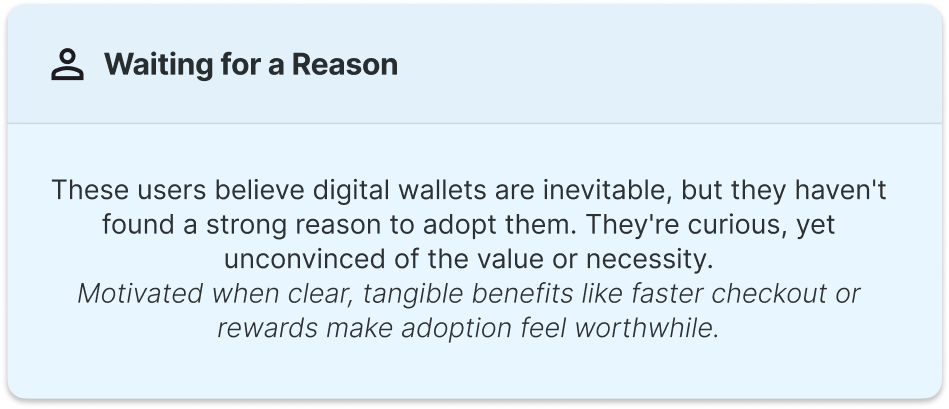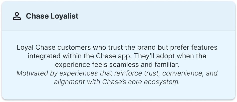 To inform how we designed and communicated the Day Zero experience, we partnered with the research team to ground our work in Chase’s established user archetypes. These archetypes reflect varying levels of familiarity, motivation, and trust around digital payments and wallet adoption, helping us understand where customers are today, and who we’re designing for tomorrow.