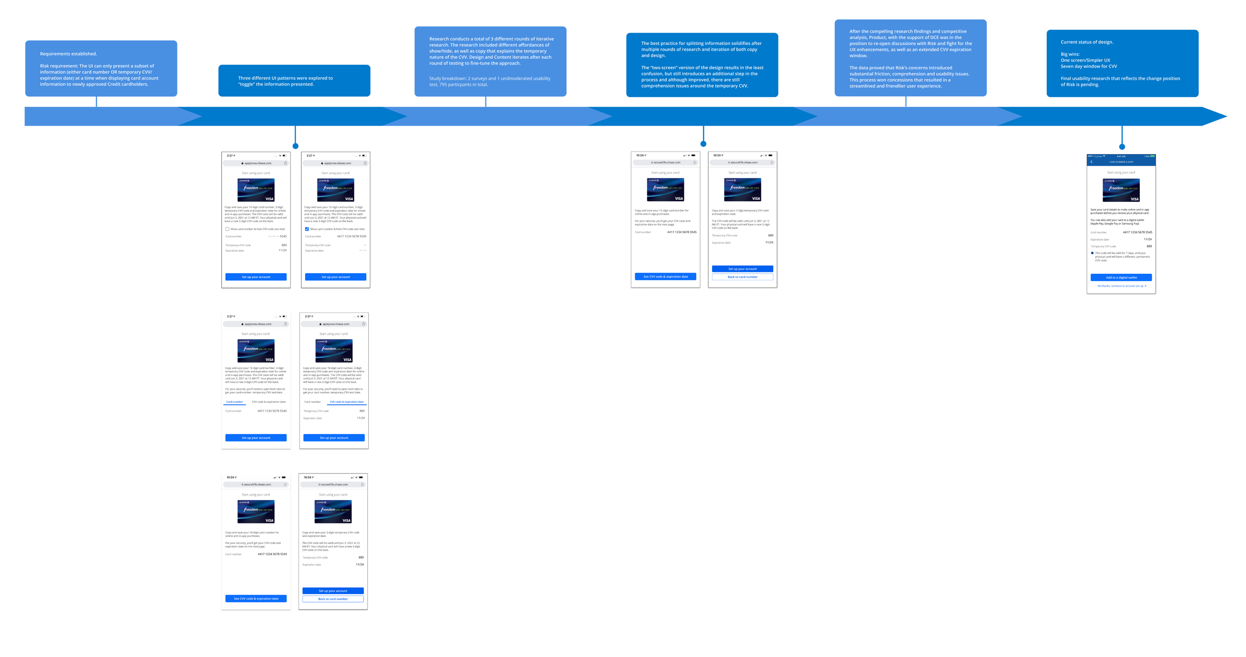 Discovery: Partnered with the research team to conduct virtual interviews with customers who recently opened a new Chase credit card. Identified key moments where instant access to card information could create value, reduce friction, and build early trust. Also conducted a competitive analysis of other banks and fintech experiences to understand how they display new card information, gather best practices, and identify opportunities to differentiate Chase’s approach.
