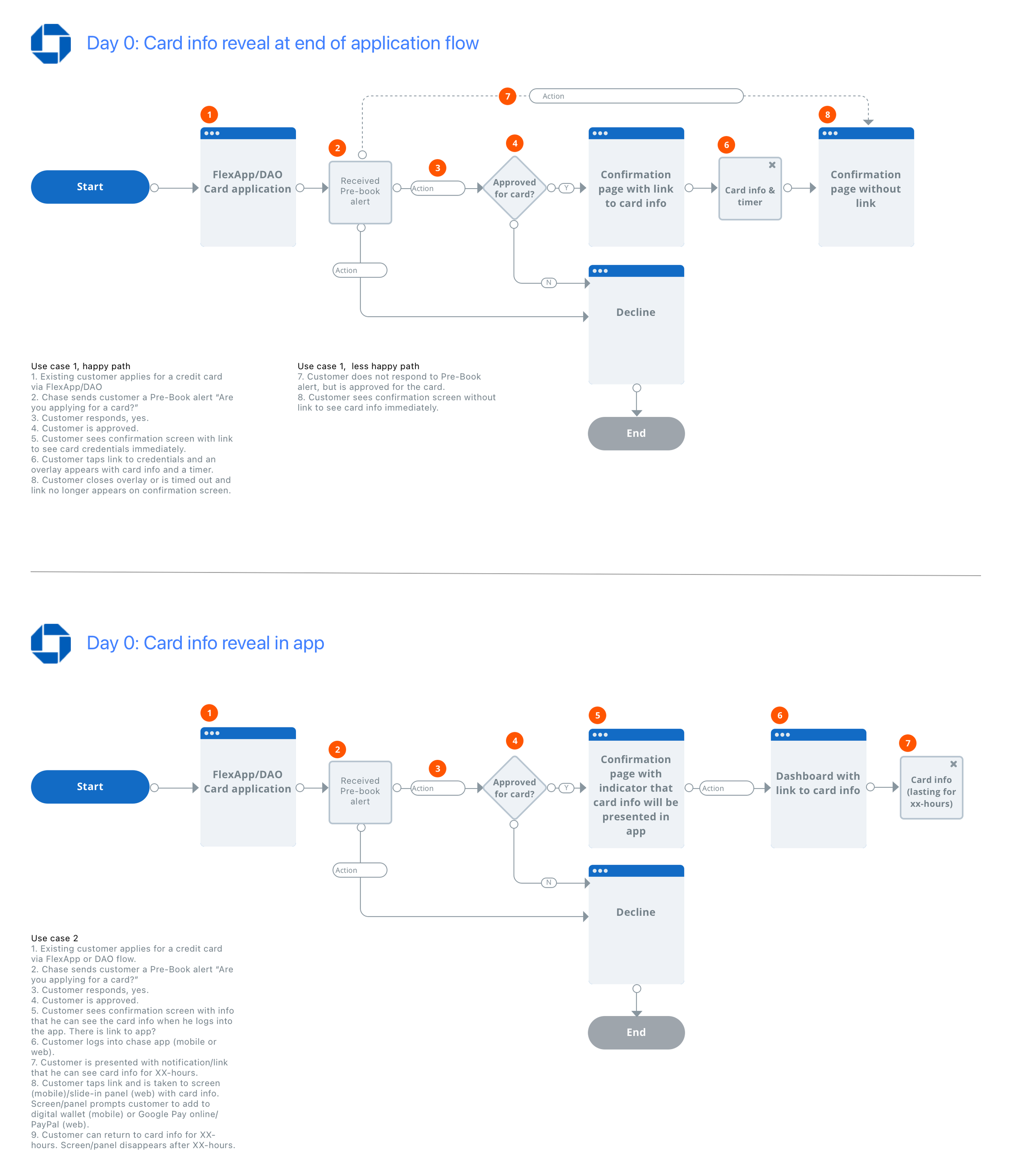 To visualize these opportunities, I mapped out the end-to-end user journeys for both scenarios. This helped clarify the overall experience, aligning cross-functional partners on dependencies and pinpointing the exact stages where we could introduce the new card information reveal in a way that felt seamless, secure, and intuitive for customers.